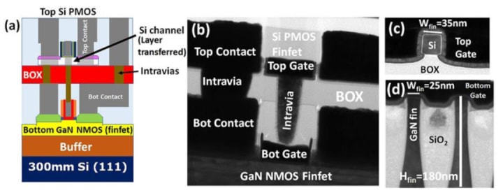 如何進(jìn)行晶體管的堆疊呢?大致兩種方法,第一種就是在晶圓上通過特殊工藝將晶體管直接做成多層的;另外一種就是和傳統(tǒng)工藝相同的方法在晶圓上制作一層晶體管,然后將多個(gè)晶圓堆疊起來,晶圓之間通過TSV連接。關(guān)于第一種方法,目前有很多研究,例如將NMOS堆疊在PMOS上,從而節(jié)省一半的面積,使晶體管密度提升一倍。其難點(diǎn)在于上層的晶體管沒有致密的硅基底作為支撐,很難制作出高質(zhì)量的晶體管,另外,目前的技術(shù)也只能支持兩層堆疊。