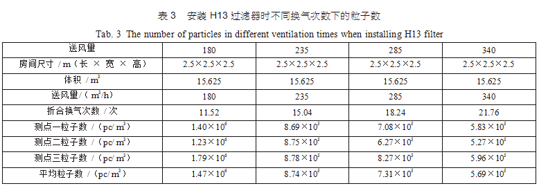 在空調(diào)機房中新建了三間2.5m×2.5m×2.5m的潔凈間,從空調(diào)主風(fēng)管引風(fēng),每支支管設(shè)置調(diào)節(jié) 閥,并設(shè)排風(fēng)機進行全排,送回風(fēng)口及測點布置分別如圖 3(每點取樣三次,取平均值)??紤]到初中效過濾器對最后潔凈度的影響和最后理論塵埃數(shù)量 計算的方便,試驗用初中效繼續(xù)分別為G4、F8,三個房間分別安裝高效過濾器,風(fēng)量500m3/h,第一組數(shù)據(jù)為送風(fēng)量按GMP 驗證指南推薦換氣次數(shù)保持不變,分別用H12、H13、H14、U15過濾器,第二組數(shù)據(jù)為采用H13高效過濾器,調(diào)節(jié)風(fēng)量 ;第三組數(shù)據(jù)為采用H14高效過濾器,調(diào)節(jié)風(fēng)量,分別測得塵埃粒子數(shù),并列表得出不同的換氣次數(shù)下對應(yīng)的塵埃數(shù)如表2、表3、表4。